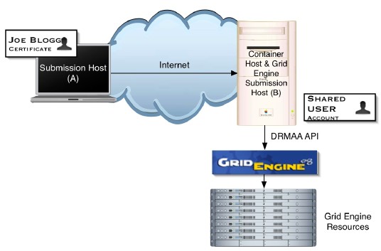 Single machine (B) running the OMII container with the GridSAM Web Service deployed. Jobs are launched onto Grid Engine managed resources through the DRMAA-Java binding. The OMII container (B) is available to the Internet. User holding a certificate trusted by the OMII container (B) can submit jobs over the internet to the GridSAM instance running on the OMII container (B). All jobs are submitted under the user account used to run the OMII container.