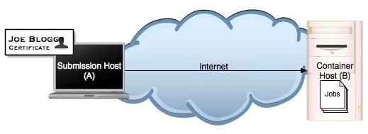 Single machine (B) running the OMII container with the GridSAM Web Service deployed. Jobs are launched on the same machine (B) as the OMII container. OMII container (B) is available to the Internet. User holding a certificate trusted by the OMII container (B) can submit jobs over the internet to the GridSAM instance running on the OMII container (B).