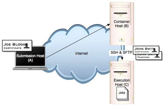 Single machine (B) running the OMII container with the GridSAM Web Service deployed. Jobs are launched on the execution machine (C). OMII container (B) is available to the Internet. User holding a certificate trusted by the OMII container (B) can submit jobs over the internet to the GridSAM instance running on the OMII container (B). Host (C) provides SSH and SFTP access to an identity used by (B), therefore GridSAM hosted on (B) can launch jobs and stage files onto the execution host securely under a DIFFERENT IDENTITY to the user operating the OMII container.
